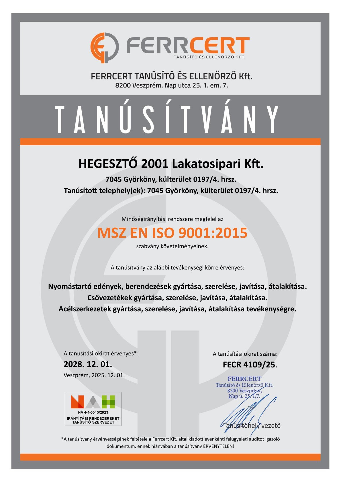 Minőségirányítási rendszerünk megfelel az ISO 9001:2015 minőségbiztosítási szabvány előírásainak.
